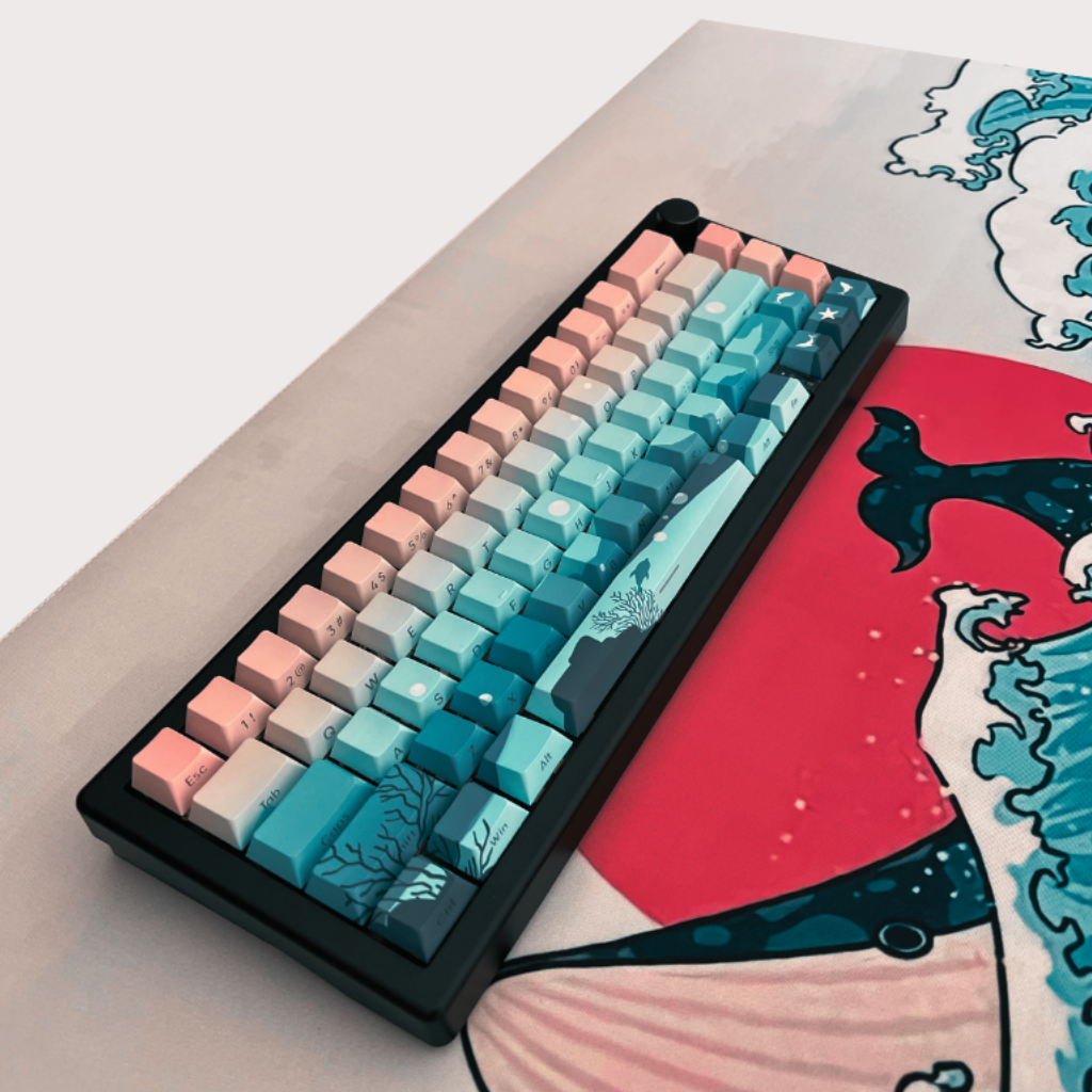 This one started with a solid barebone in Black, carefully matched with tactile brown switches and Deep Ocean style keycaps for a satisfying feel and standout look.