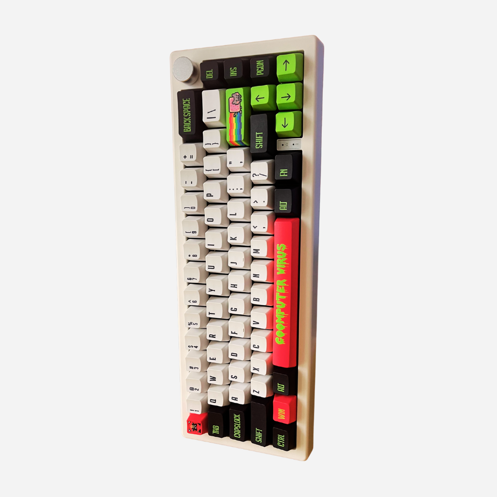 A white base, pairing tactile red switched layered with an outstanding cyber virus keycaps set